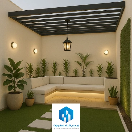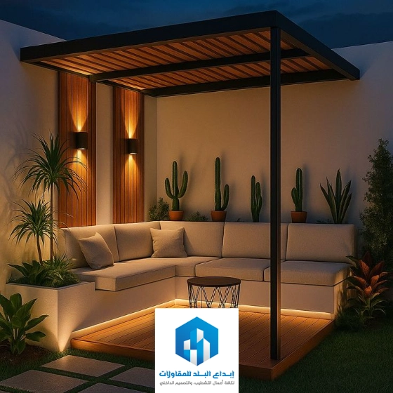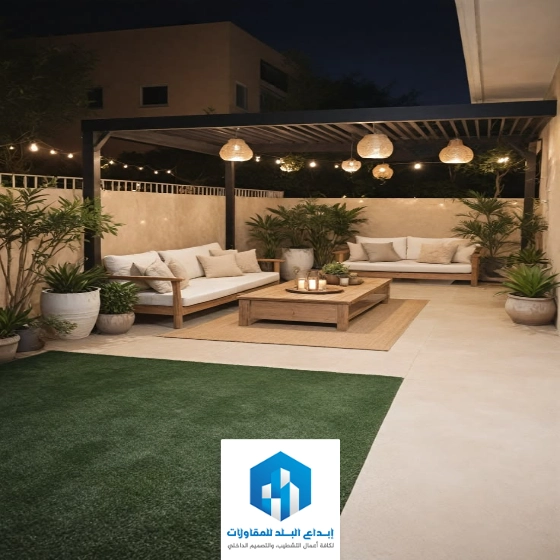 4. تهيئة المكان بإضافة عشب صناعي وإضاءة تبرز جمال التصميم المسائي بوضوح.